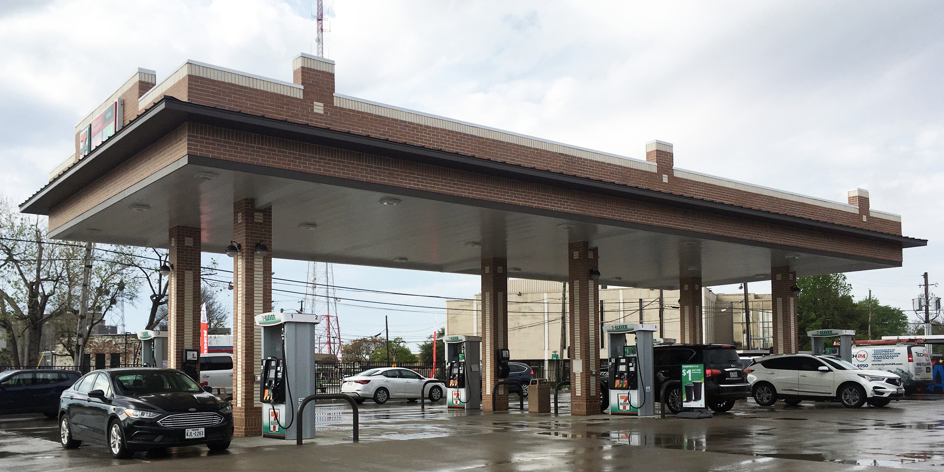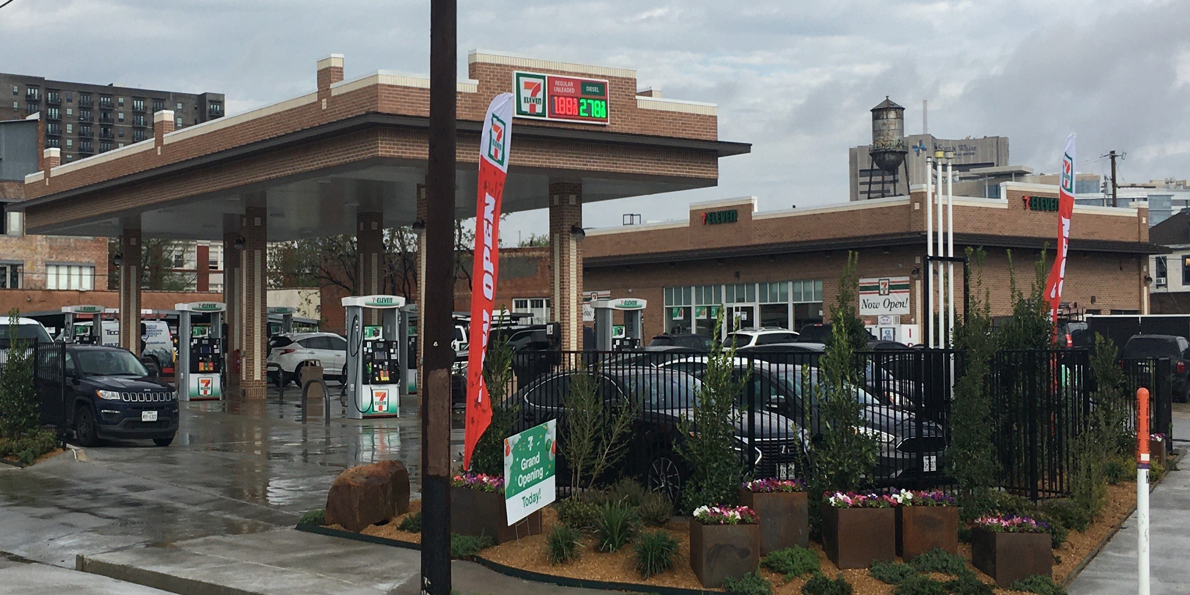 The Orange house in a blue field has gone. The new 7-Eleven ground-up store and the fuel canopy fit well at the corner of Commerce Street & Exposition Avenue in Deep Ellum. The well-designed flagship store has unique detailing, Fuel canopy design, and landscaping. The design incorporates green building principles and safety design elements.