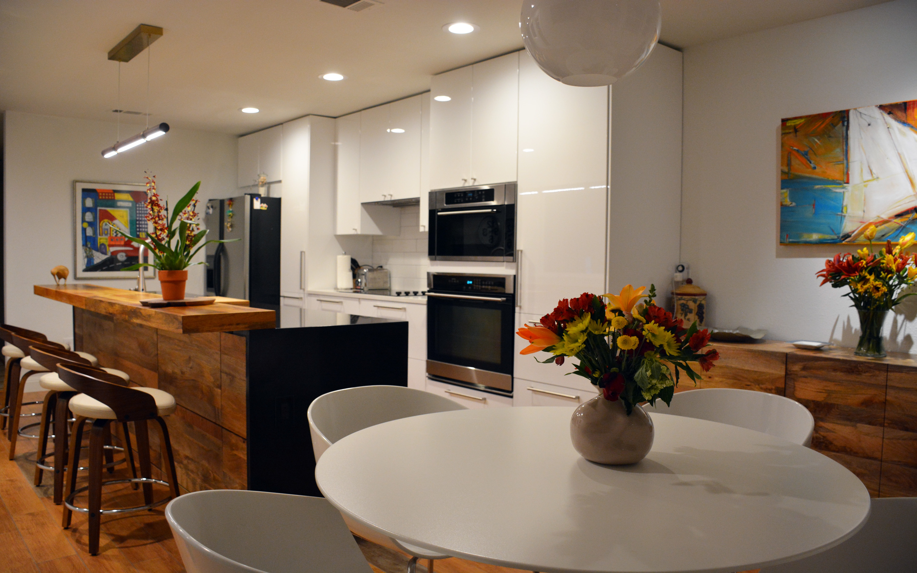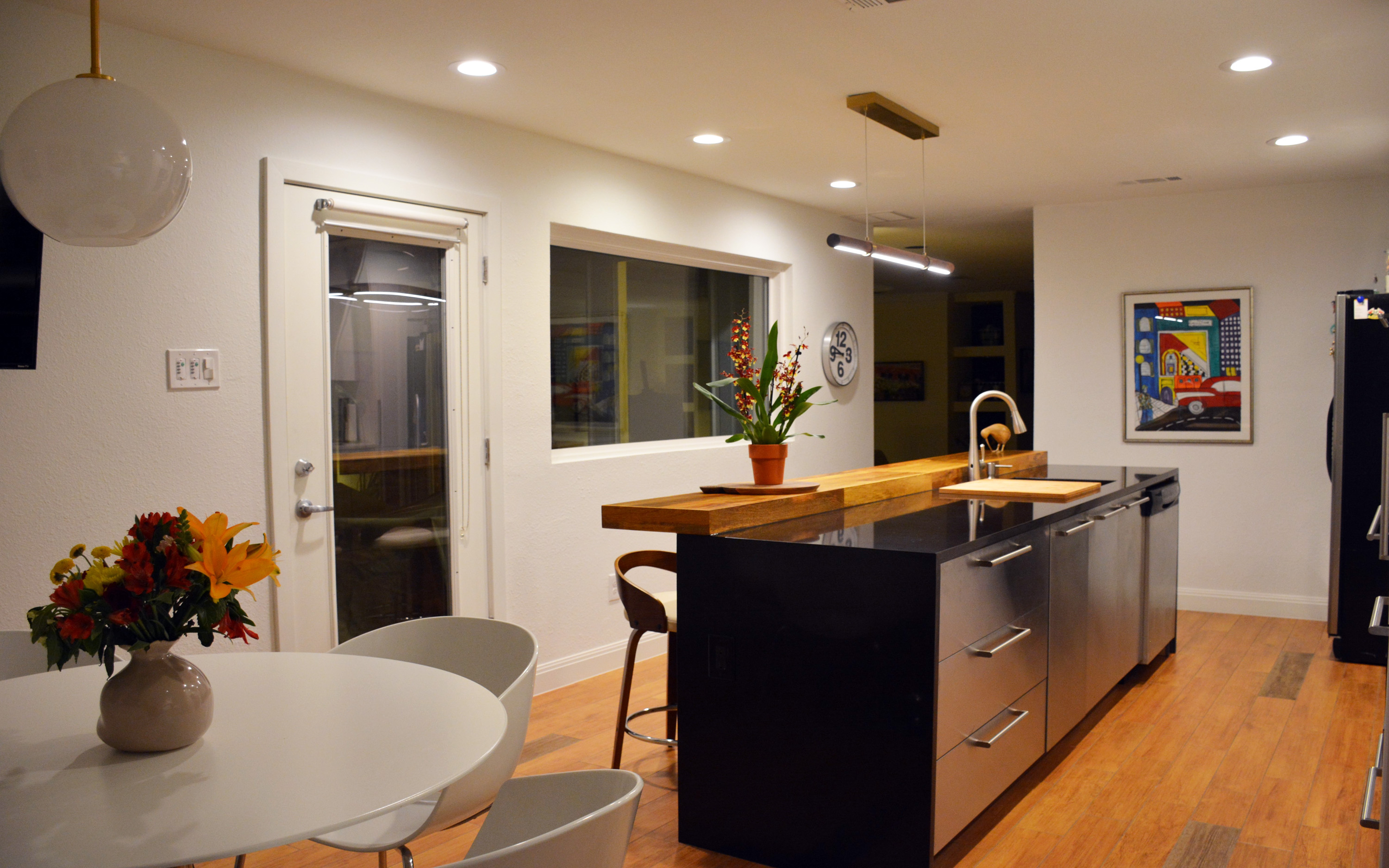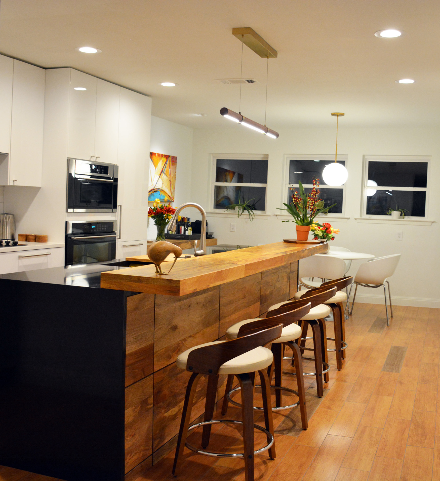 The attractive kitchen remodel applies a modern-industrial style featuring 10' long island and finishes combining tiles, quartz, steel, and wood materials.