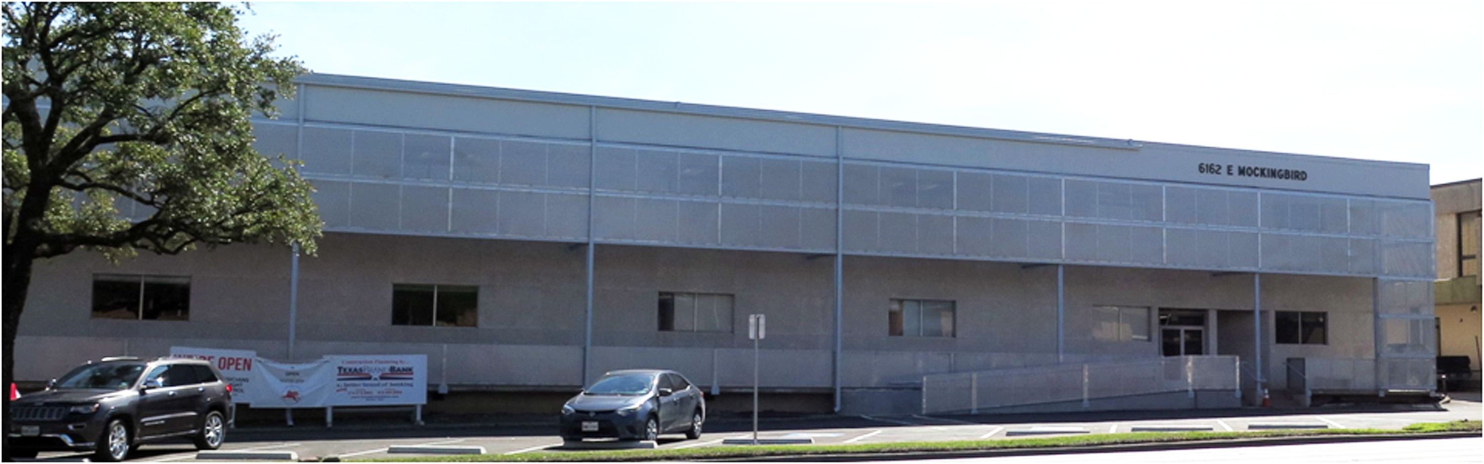 The 2-story office building is located at E. Mockingbird Ln in Dallas. The exterior remodel features the removal of the existing screen panels to increase natural light in the office spaces and creating the steel structure using the existing grid enhanced with the selected finishes. The gutters and downspouts are well incorporated into the parapet wall and the rear entry canopy.